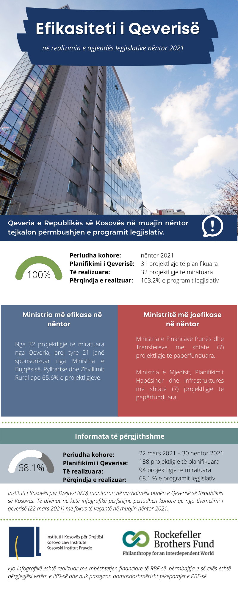 Prishtinë, 4 dhjetor 2021 – Instituti i Kosovës për Drejtësi (IKD) monitoron në vazhdimësi punën e Qeverisë së Republikës së Kosovës. Të dhënat në këtë infografikë përfshijnë periudhën kohore nga themelimi i qeverisë (22 mars 2021), me fokus të veçantë në muajin nëntor 2021.