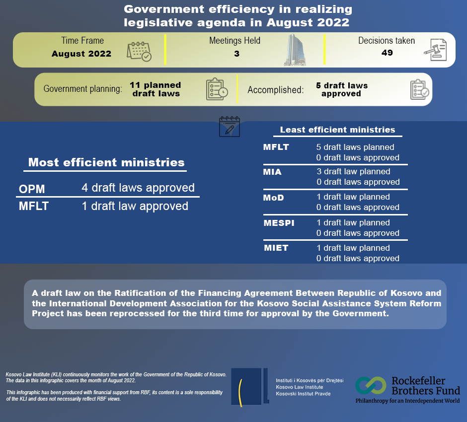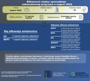 The Government of the Republic of Kosovo, in the legislative agenda for the month of August 2022, has planned the approval of eleven (11) draft laws. It has approved five (5) draft laws, which were not planned in the legislative program and which are international agreements where one of them has been three times reprocessed for approval, due to lack of supportive votes in the Assembly of Kosovo. The Government has not approved any of the draft laws planned for the month of August 2022