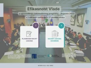The Government of Kosovo, during the month of August 2023, held 2 meetings and took 27 decisions. In the legislative agenda for the month of August 2023, the Government planned the approval of two draft laws. However, it has approved only one of the planned draft laws.