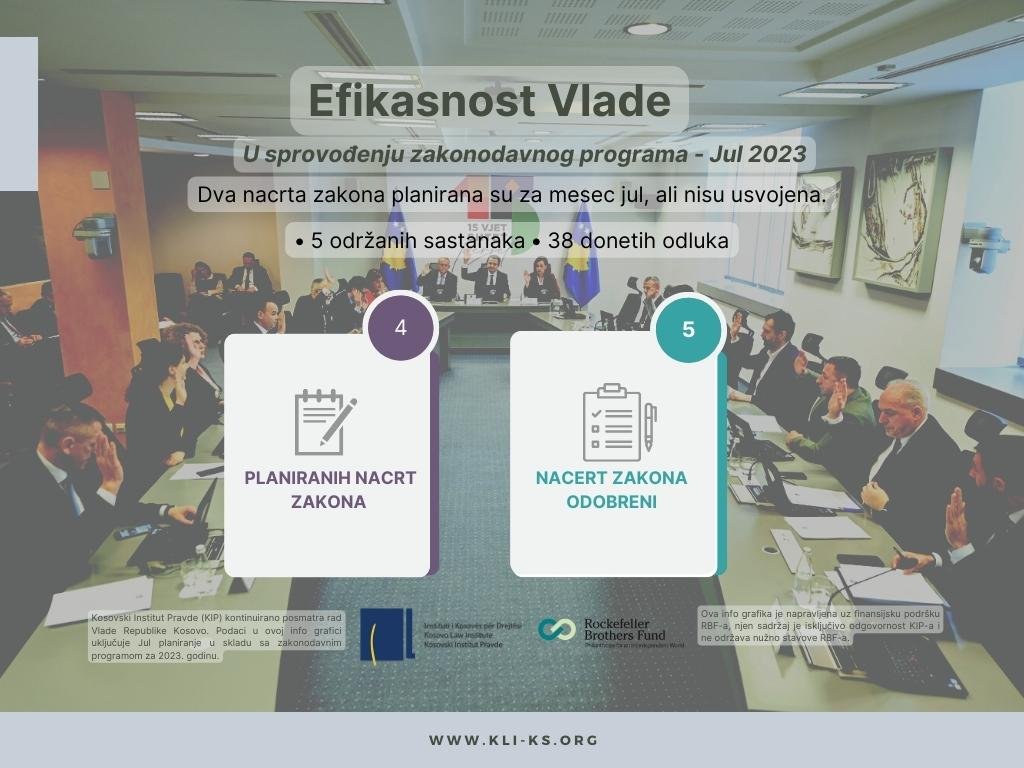 Në agjendën legjislative për muajin Korrik 2023, Qeveria ka planifikuar miratimin e katër projektligjeve. Ajo ka miratuar pesë (5) projektligje, prej të cilave dy që kanë qenë të planifikuara për muajin korrik, një në muajin shkurt dhe dy projektligje në muajin qershor. Ajo nuk i ka miratuar dy projektligje të planifikuara në muajin korrik.