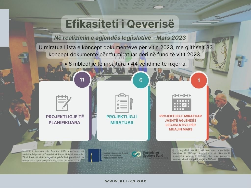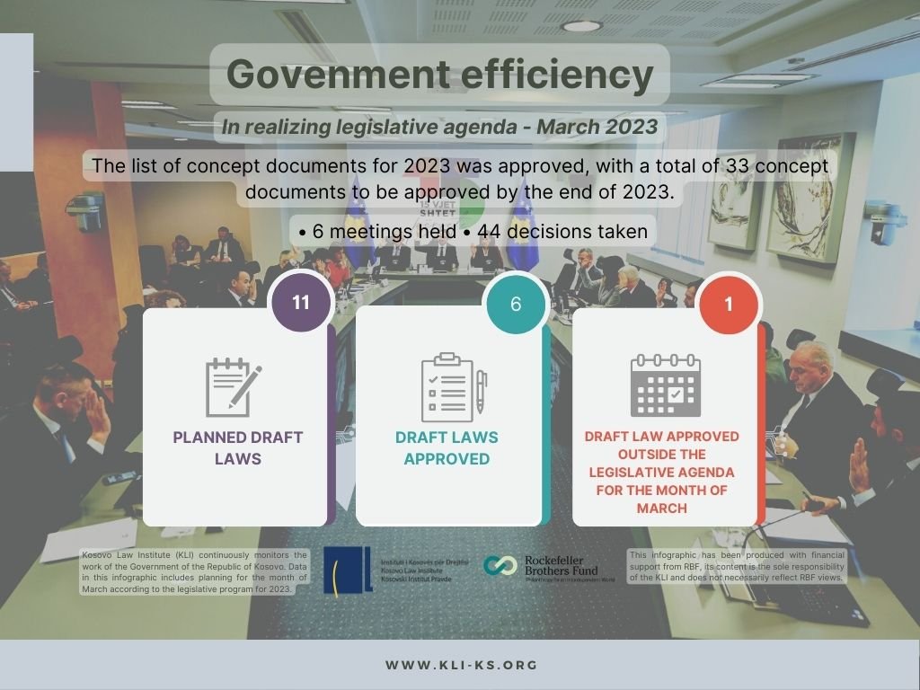 - During the month of March 2023, the Government of Kosovo held six meetings and took 44 decisions. It approved the List of concept documents for 2023, which contains a total of 33 concept documents to be approved by the end of 2023.
