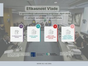 The Government of Kosovo, during the month of April 2024, held five meetings and took 40 decisions. In the legislative agenda for the month of April 2024, 3 draft laws are planned for approval, while the government did not approve any draft law according to the plans. It has approved four draft laws outside the legislative planning, one bill it did not approve in February and one in March. The government has approved a draft law planned for approval in December 2024.