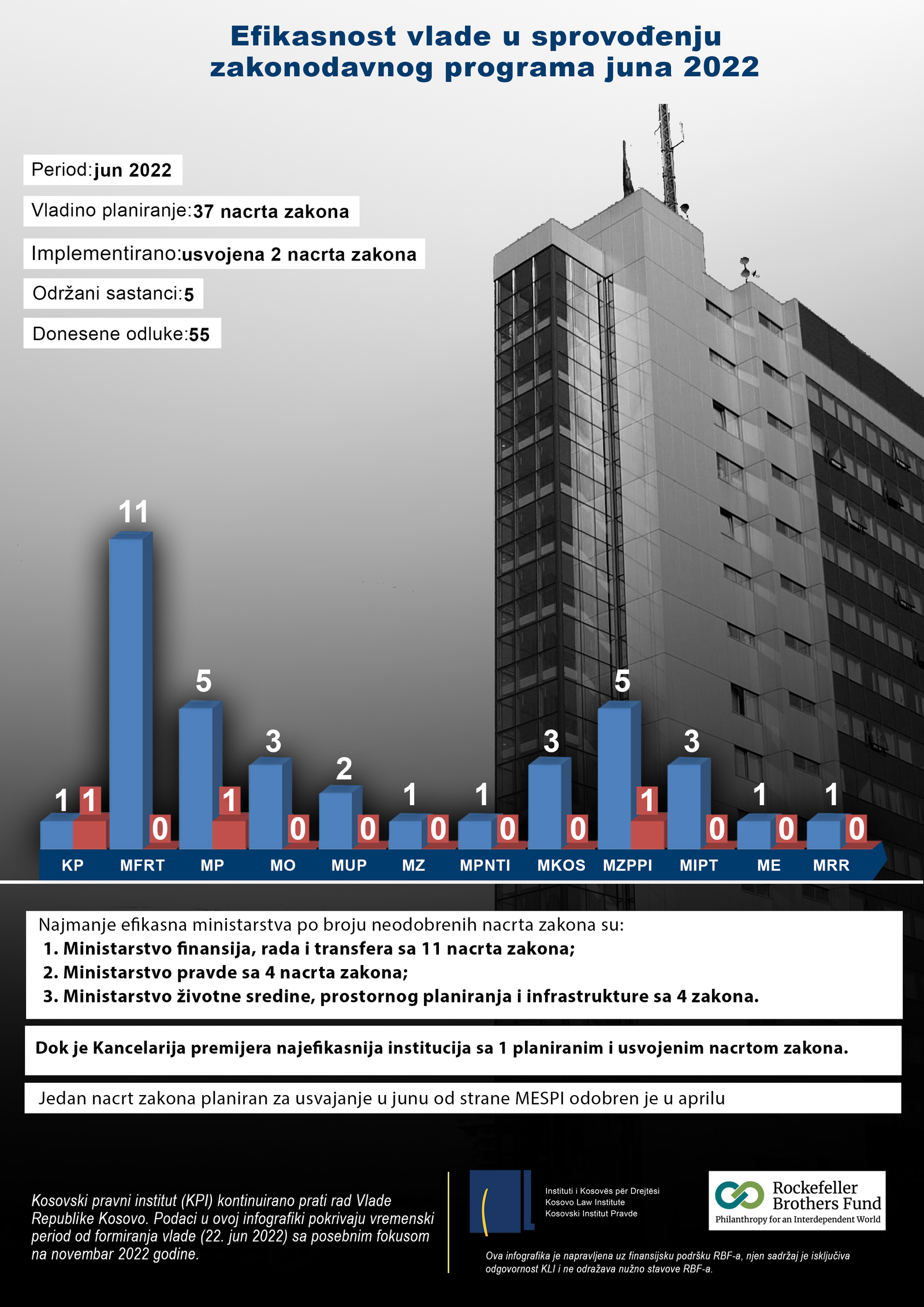 Vlada Republike Kosovo nije uspela da usvoji 37 nacrta zakona planiranih u zakonodavnom programu za mesec jun 2022. Vlada je uspela da usvoji samo dva (2) nacrta zakona. Dok je jedan od nacrta zakona planiranih za jun mesec usvojen u Aprilu (Nacrt Zakona o Integrisanom Sprečavanju i Kontroli Zagađivanj Životne Sredine;)