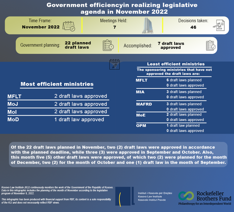 The Government of the Republic of Kosovo has planned the approval of 22 draft laws in the legislative agenda for the month of November 2022. Of the 22 draft laws planned in November, only two (2) draft laws were approved in accordance with the planned deadline. Three (3) draft laws planned for this month: two (2) were approved in September and one (1) in October.