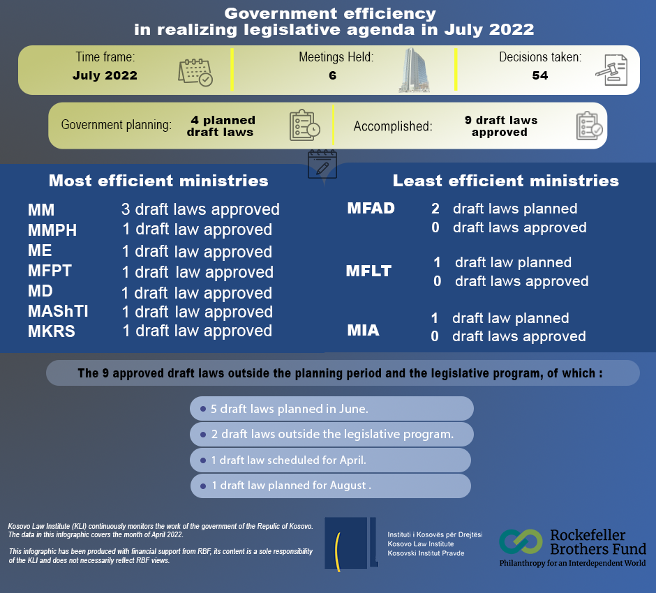 The Government of the Republic of Kosovo, in the legislative agenda for the month of July 2022, has foreseen the approval of four (4) draft laws. The Government has approved nine (9) draft laws. 7 draft laws approved outside the planning in the legislative program for the month of July 2022 and 2 outside the legislative program, as follows:
