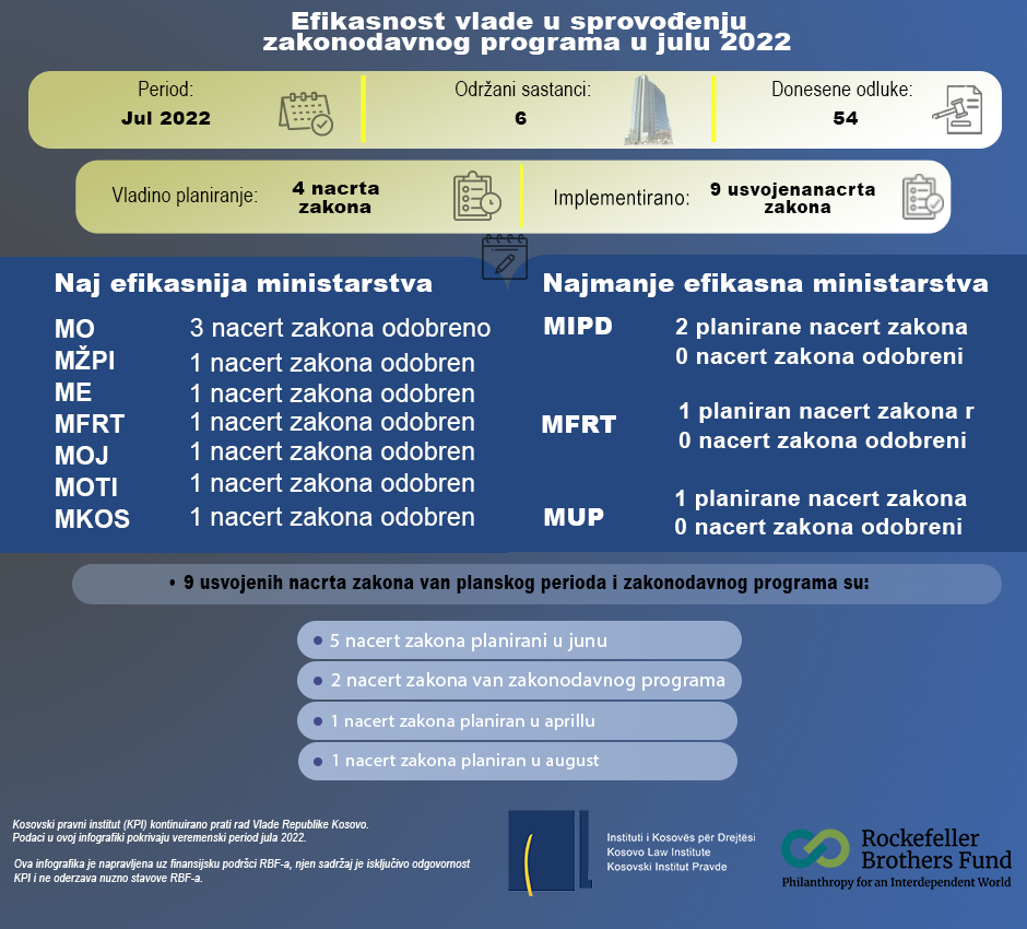 Vlada Republike Kosovo je u zakonodavnom programa za juli mesec 2022. godine predvidela usvajanje četiri (4) nacrta zakona. Odobrene su devet (9) Nacrt zakona. 7 Nacrt zakona, usvojene van planiranja zakonodavnog programa za juli mesec 2022. godine i 2 van zakonodavnog programa, i to: