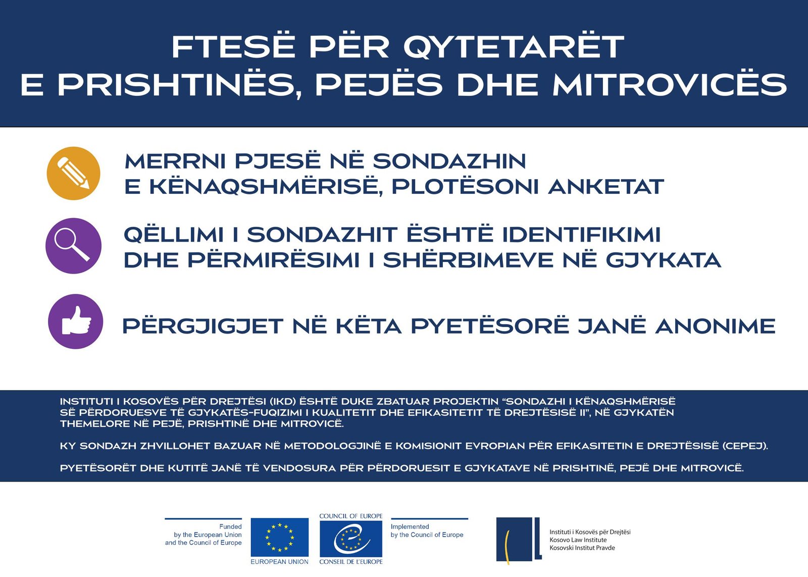 Instituti i Kosovës për Drejtësi (IKD) fton qytetarët e Prishtinës, Pejës dhe Mitrovicës të marrin pjesë në sondazhin e kënaqshmërisë, duke plotësuar anketa të cilat gjenden në objektet e tri Gjykatave Themelore.