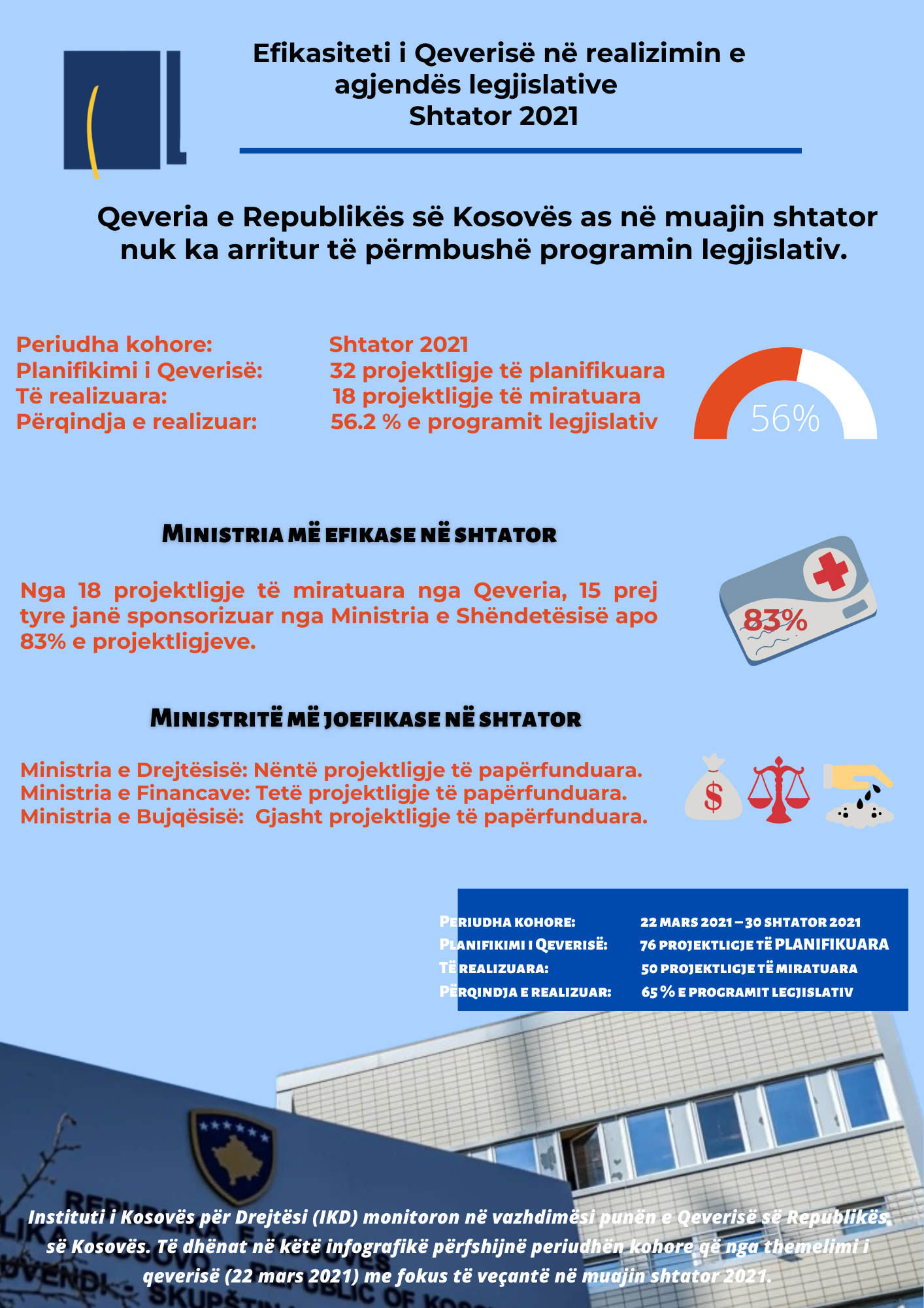 Prishtinë, 7 tetor 2021 – Instituti i Kosovës për Drejtësi (IKD) monitoron në vazhdimësi punën e Qeverisë së Republikës së Kosovës. Të dhënat në këtë infografikë përfshijnë periudhën kohore nga themelimi i qeverisë (22 mars 2021), me fokus të veçantë në muajin shtator 2021.
