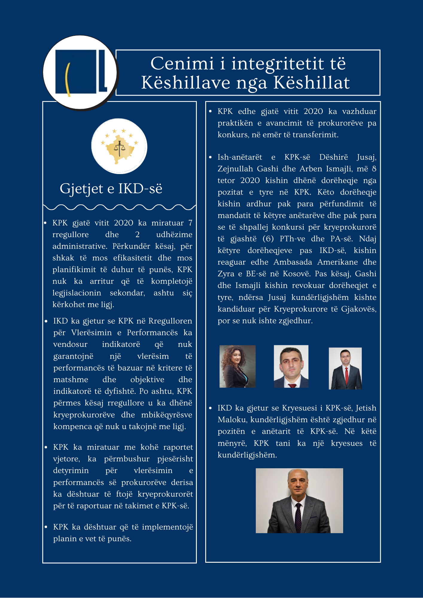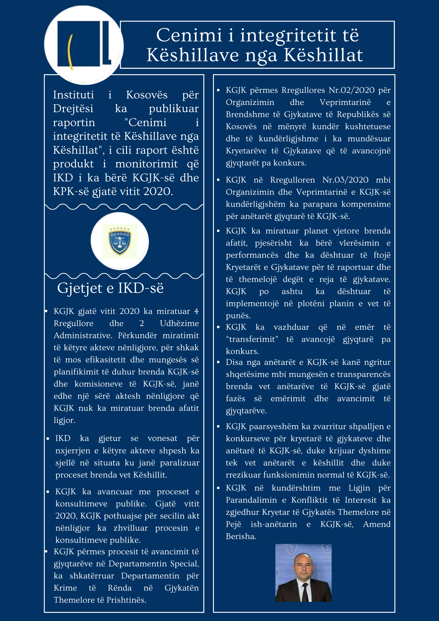 Për më tepër, shkarkoni raportin e IKD-së “Cenimi i integritetit të Këshillave nga Këshillat – Raporti i monitorimit të Këshillit Gjyqësor dhe Prokurorial në vitin 2020”.