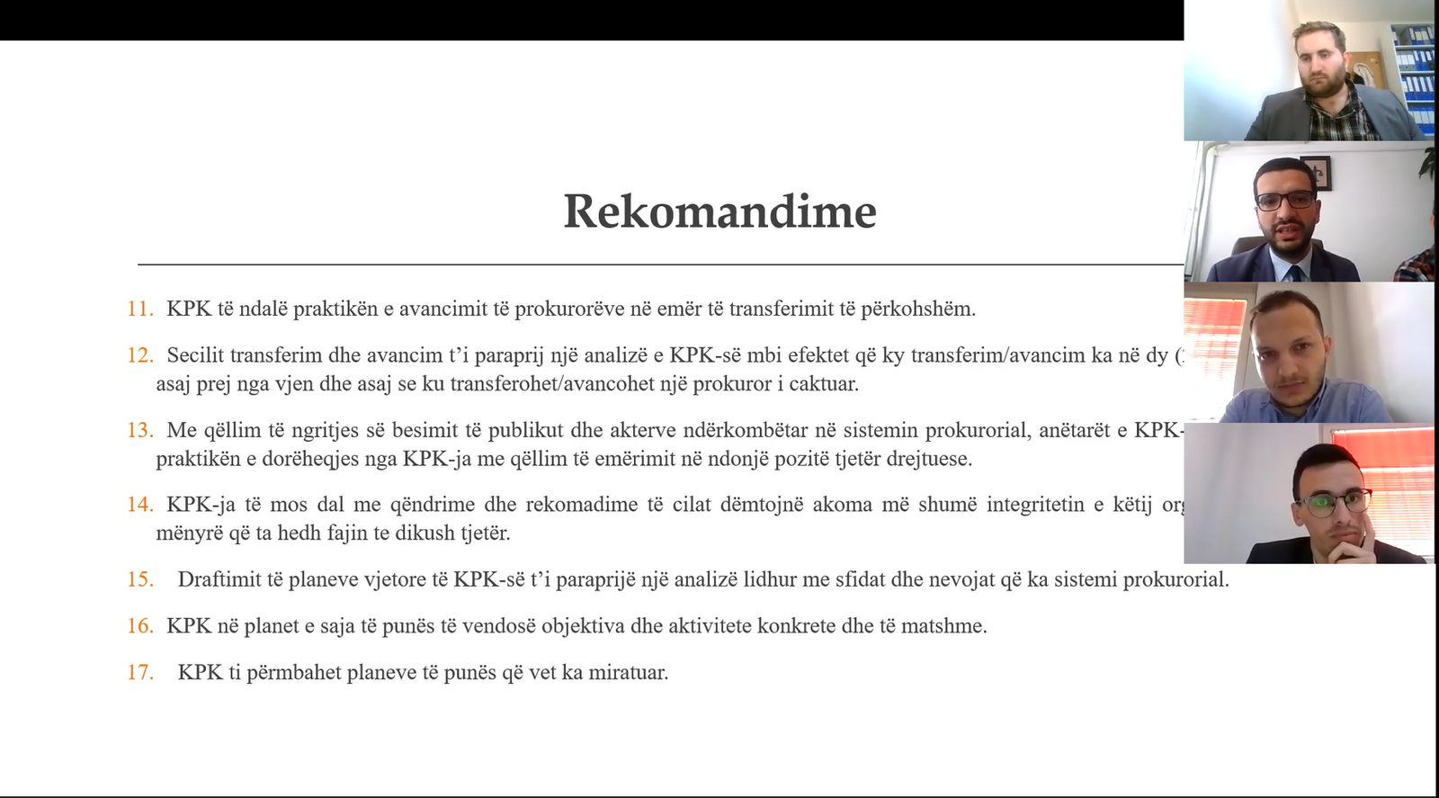 Ndërsa lidhur me mos publikimin e vendimeve të KPK-së në web-faqën zyrtare, Shala tha se IKD gjithmonë ka pasqyruar progresin e bërë nga KPK dhe KGJK në publikimin e vendimeve të tyre, por sipas tij te rasti i KPK-së, në vitin 2020, nuk janë publikuar 35% e tyre, çka paraqet një shifër shumë të lartë.