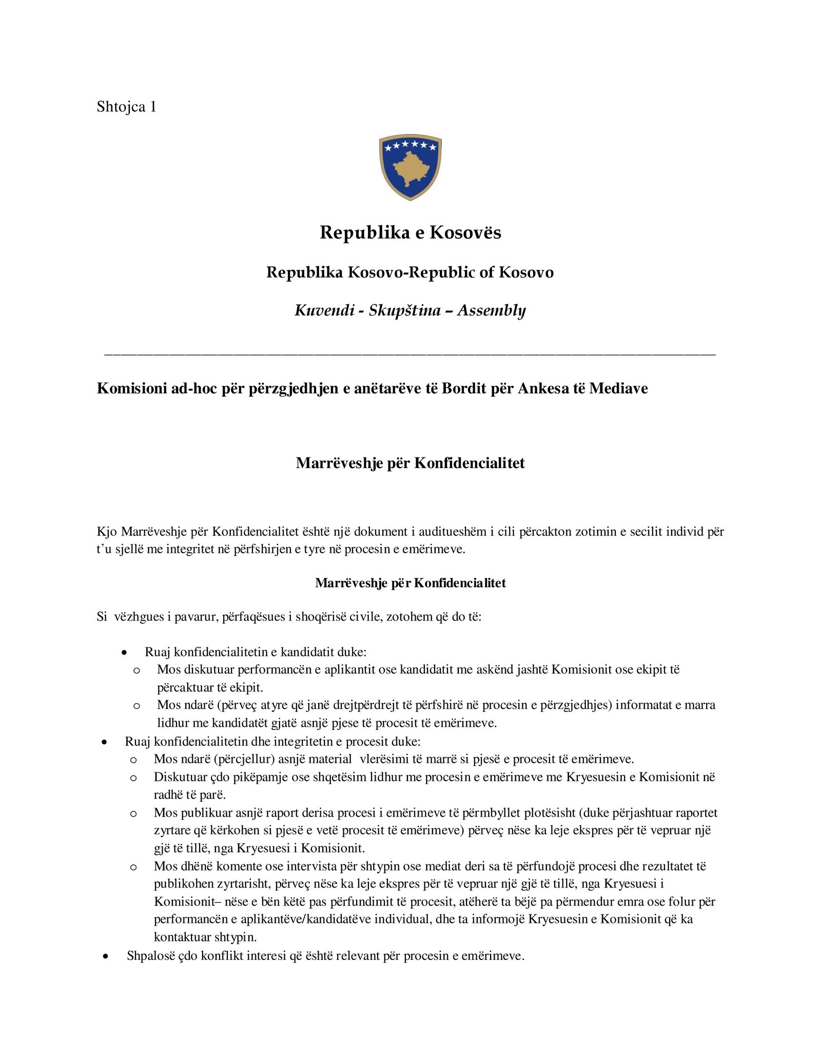 Megjithëse çmojmë nevojën e ruajtjes së integritetit të procesit, Marrëveshja për Konfidencialitet është e kundërligjshme. Ligji Nr. 04/L-44 për Komisionin e Pavarur të Mediave përcakton që “[a]nëtarët e Bordit për Ankesa emërohen nga Kuvendi i Kosovës në bazë të procedurave të hapura dhe transparente” (neni 38(1)). Kjo dispozitë pamundëson tendencat e dëmshme të Komisionit ad-hoc që procedurat e përzgjedhjes së anëtarëve të mbyllen përmes marrëveshjeve për konfidencialitet. Kushtëzimi i pjesëmarrjes së përfaqësuesve të shoqërisë civile në procesin e përzgjedhjes me nënshkrimin e kësaj marrëveshjeje cenon kërkesën ligjore që procedura të jetë e hapur dhe transparente, duke ua pamundësuar përfaqësuesve të shoqërisë civile që të shprehen lirshëm lidhur me gjetjet eventuale.
