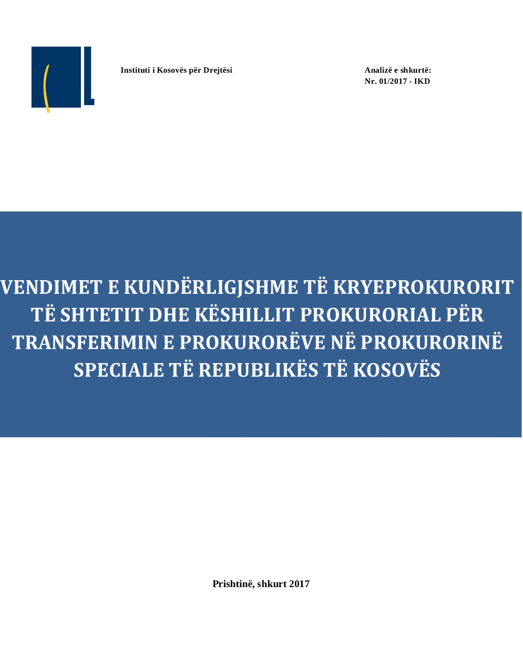 Prishtinë, 07 shkurt 2016 – Instituti i Kosovës për Drejtësi (IKD) reagon kundër vendimeve të kundërligjshme të Kryeprokurorit të Shtetit, z. Aleksandër Lumezi dhe Këshillit Prokurorial i Kosovës (KPK), rreth praktikës së “transferimit” të prokurorëve të shtetit në kundërshtim me ligjin dhe rregulloret e miratuara nga vet KPK.